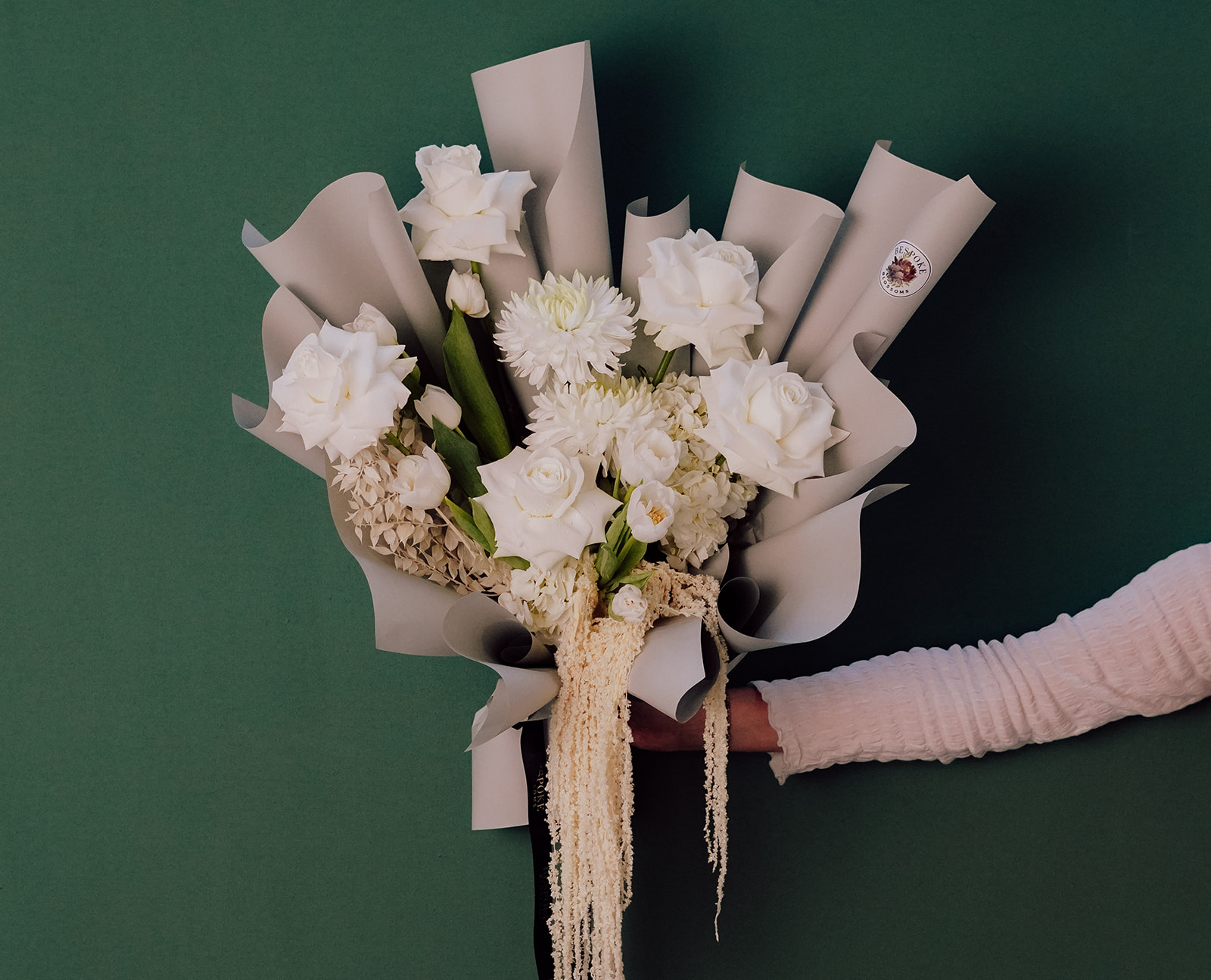 Delight in the elegance of Whipped Cream, a modern all-white bouquet that embodies sophistication, and romance. This luxurious arrangement features an exquisite selection of white garden roses, hydrangea, chrysanthemums, tulips, cascading amaranths, and more, beautifully arranged to create a serene and stunning display.